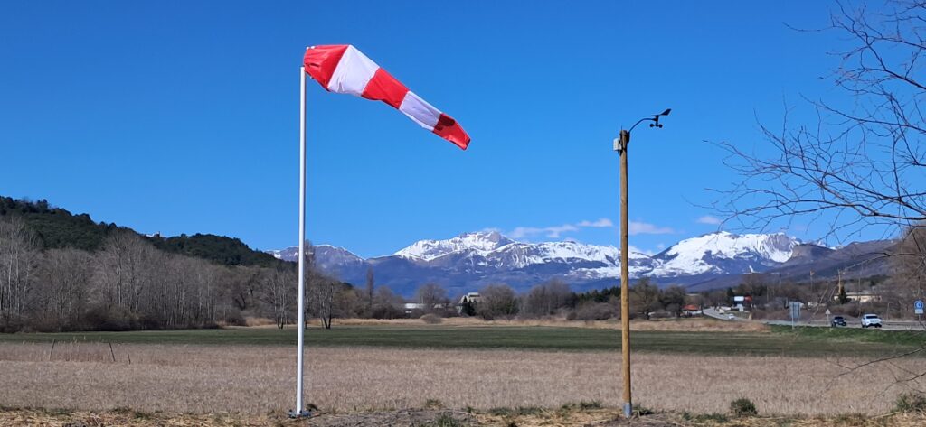 Deux manches à air au déco, une manche à air à l’atterro, et deux panneaux d’informations sur ce site aux conditions de vol un peu particulières.